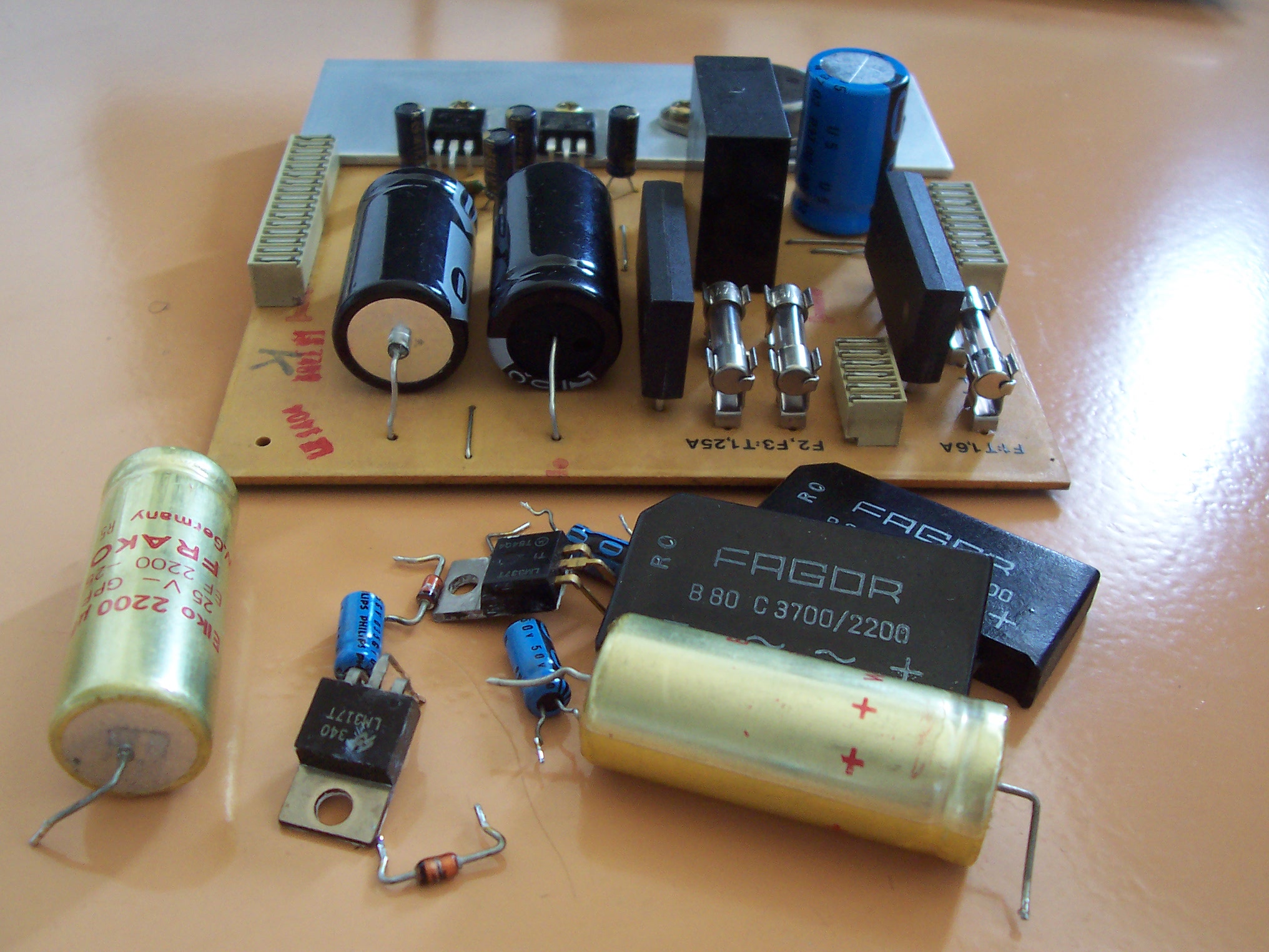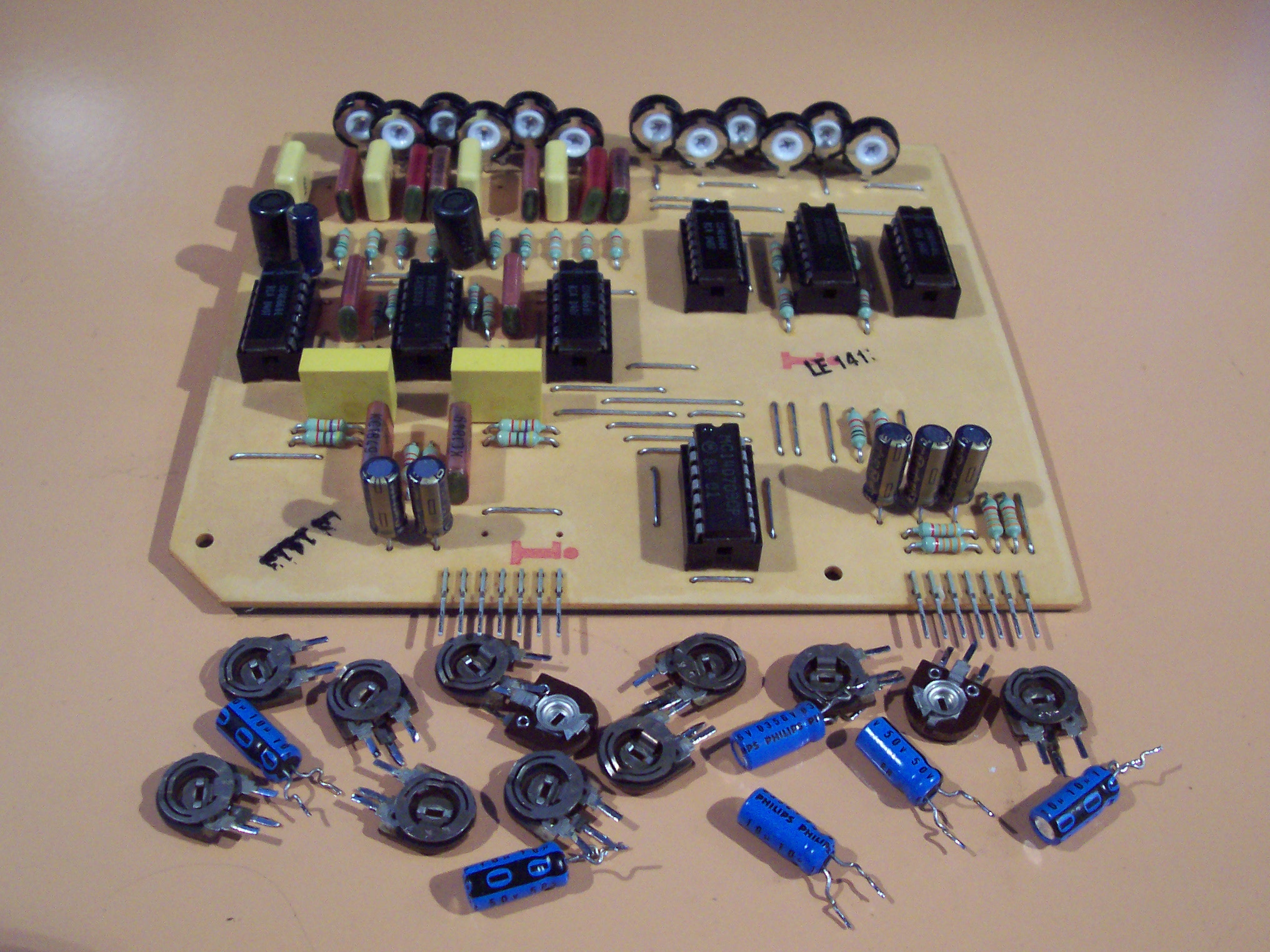 Daarna werkte de A710 weer, maar het klonk niet geweldig. En nieuwe opnames klonken dof en donker. Van de vier kleine Philips elco's in het netdeel waren er drie slecht. Dan kun je veilig aannemen dat de overige elco's van die soort ook niet best meer zijn. Als je alle condensatoren vervangt moet er opnieuw afgeregeld worden. Daarvoor moeten alle instelpotmeters nog goed zijn. Die waren ook nog allemaal origineel. Vandaar dat op alle andere boards na schoonmaak de elco's, tantaalcondensatoren en instelpotmeters vervangen zijn. Verder waren de aandrukrollen hard en glad geworden en klonk er een wat vervelend mechanisch geluid bij het vooruit spoelen. Een lager?