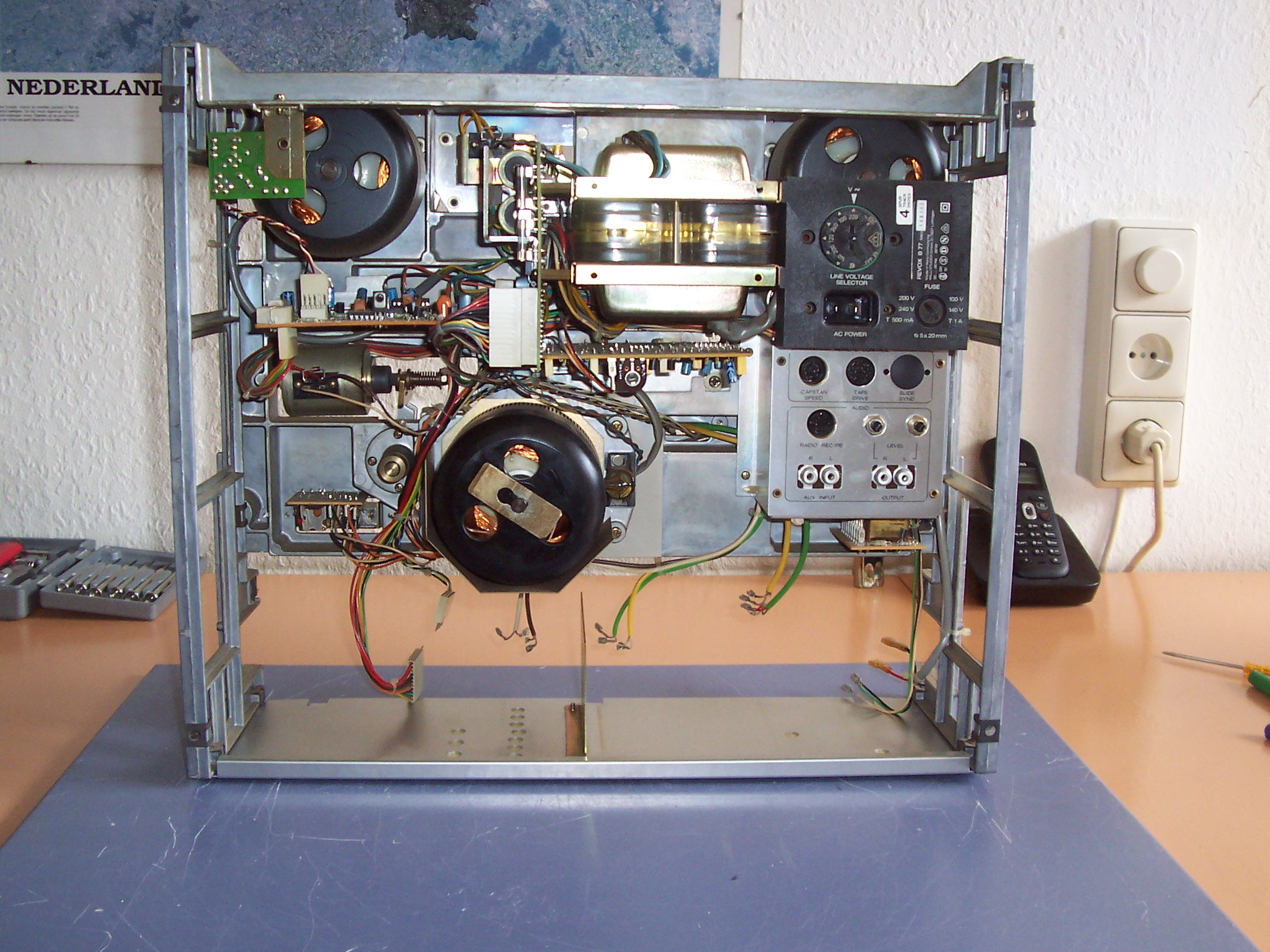 De eerste stap was demonteren en schoonmaken. In de service manual staat demontage stapsgewijs beschreven. Daarin staat ook hoe de onderdelen met elkaar verbonden zijn, in de schema's is terug te vinden welke draad waar hoort. Niet alleen kun je zo alles schoonmaken, je kunt ook rustig bekijken wat er vervangen moet worden. De foto hiernaast toont de B77 met uitgebouwde bedieneenheid. Alle printplaten zijn schoongemaakt met een printplaatreiniger in een ultrasoon bad. Geen overbodige luxe, er was zo te zien ooit chocolademelk in gekiept. Met een ultrasoon reiniger krijg je dat weer schoon. In deze fase heb ik ook de vier Rifa condensatoren vervangen door vier Wima's die ik nog had. Al met al was dit een weekend werk. Op zondagavond had ik een schone, werkende B77 en een lijst met te vervangen onderdelen.