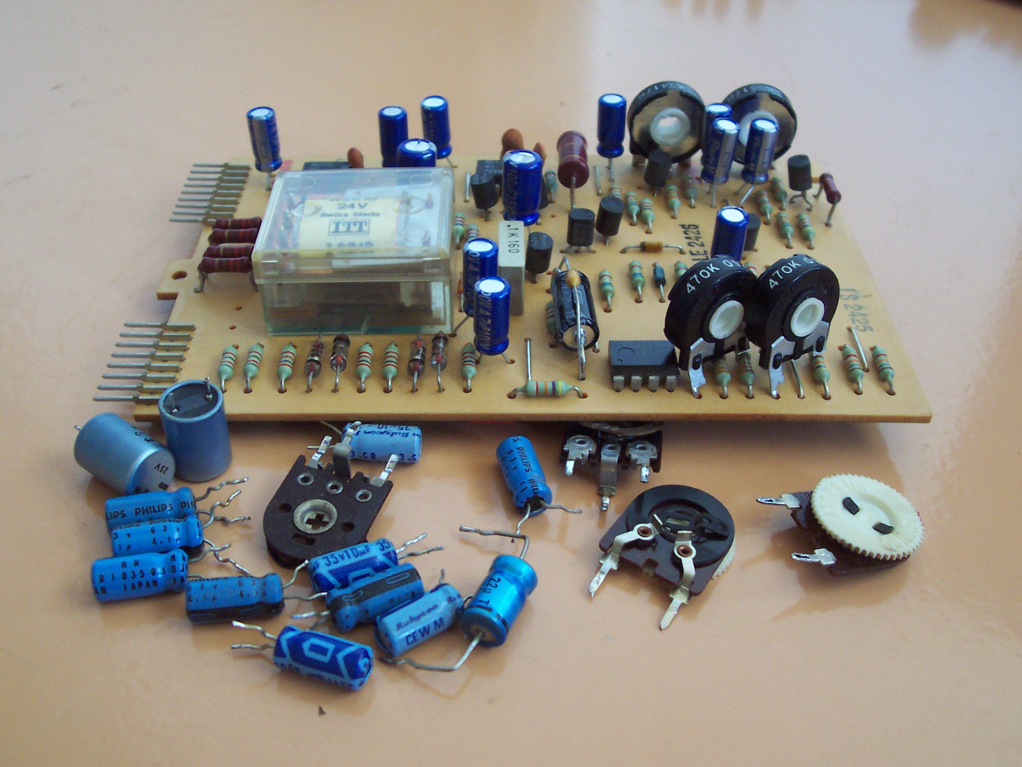 De koppen, motoren, trafo en magneten waren nog in orde. Mooi, want dat zijn dure vervangingen. Mijn lijst zag er als volgt uit: Op het netdeel alle onderdelen behalve de weerstanden, op alle andere printplaten de elco's, de tantaalcondensatoren en de instelpotmeters. Daarnaast heb ik de drie motorcondensatoren (achter het paneel met de aansluitingen) vervangen. Alle onderdelen op de lijst bleken goed en relatief goedkoop verkrijgbaar via de electronicahandel. Het kost wel een avondje om zo'n bestelling via internet bij elkaar te klikken. Tip: Probeer af en toe de bestelling op te slaan. Dan hoef je niet helemaal opnieuw te beginnen als de server omvalt...