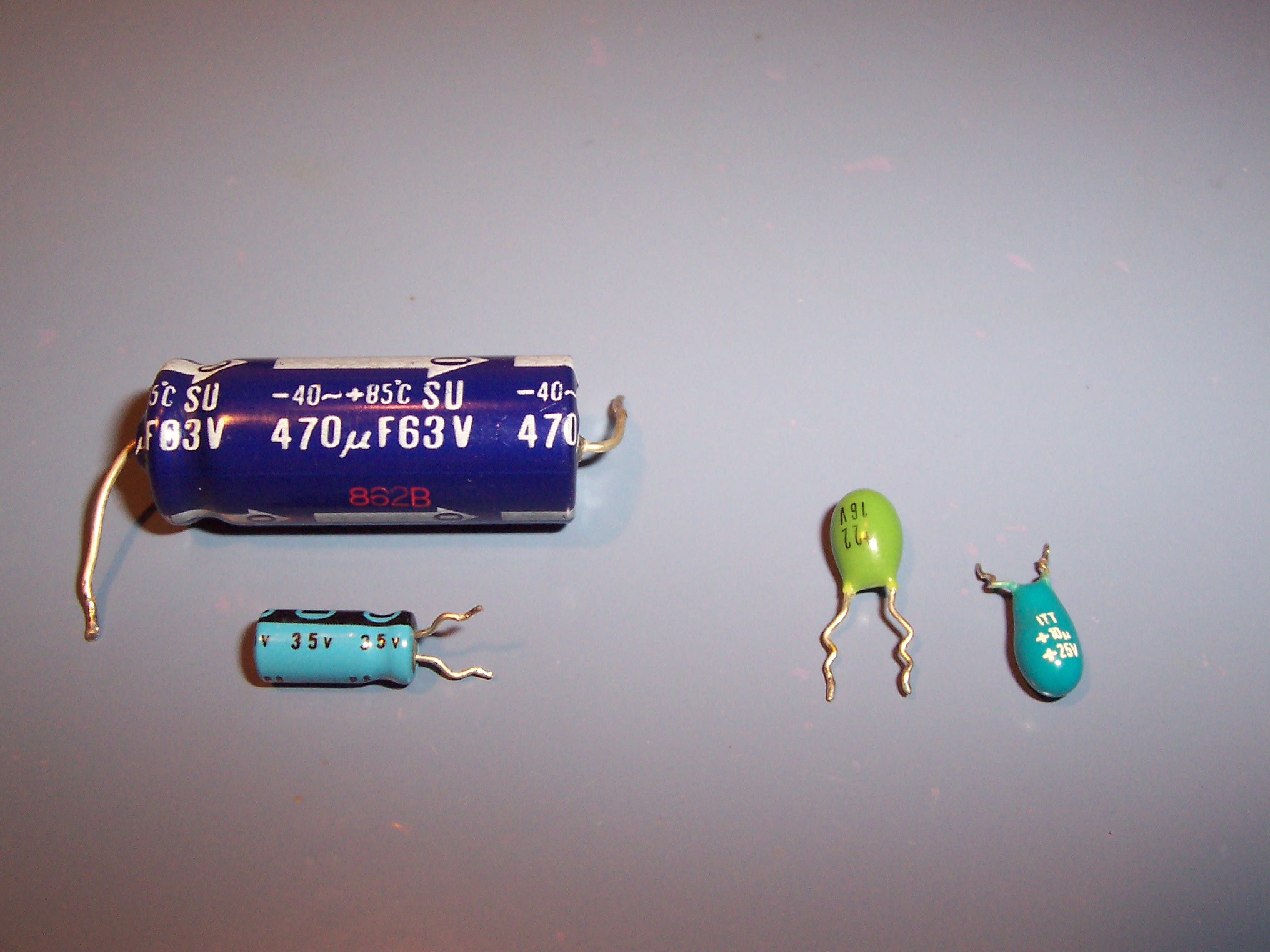 Condensatoren zijn er in verschillende soorten. De soorten die problemen opleveren zijn electrolytische condensatoren (elco's) en tantaalcondensatoren. De eersten zijn cylindervormig, de tantaalcondensatoren zijn druppelvormig. Zie de foto hiernaast. Het electrolyt in elco's verdampt met de jaren, waardoor de capaciteit tot nul zakt. In de praktijk gaat het niet om bepaalde merken of types, het lijkt er op dat bepaalde produktieseries meer problemen geven dan andere. Als de eerste twee 47 microfarad elco's in orde zijn, zijn de andere 47uF in het apparaat het vaak ook. Om de capaciteit van een elco te meten moet een aansluiting losgesoldeerd worden. Omdat de meeste elco's weinig kosten is het dan sneller om meteen de elco te vervangen.