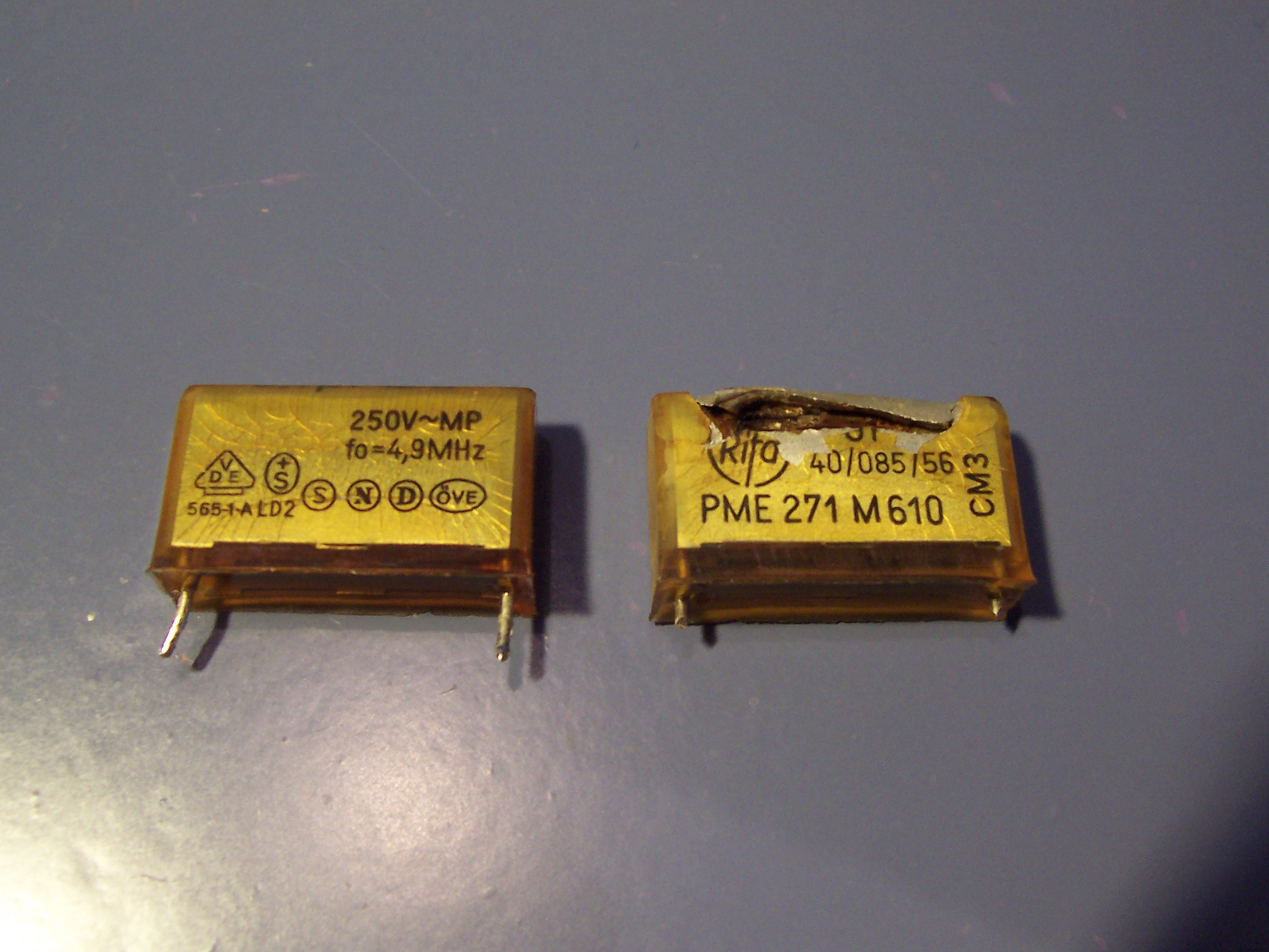 Bij Studer en Revox duikt nog regelmatig een derde probleemtype op, condensatoren van Rifa. Het aardige van deze is dat het probleem goed zichtbaar is. Het is te herkennen aan veel kleine barstjes in de kunstof behuizing, die er craquelé uitziet. Zie de foto hiernaast. Dat eindigt op enig moment met een knal, een vonk en wat rook. Ondere andere Wima levert hiervoor goede vervangers.